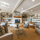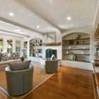 The living room opens onto a spacious family/media room with hardwood floors, built-in shelves, fireplace with tile accents, and a wet bar for entertaining. Guests can meander out on the balcony to watch the sunset over the bay.
