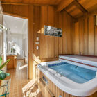 On one side of the kitchen is a powder room, on the other is a magical surprise: a cedar-lined spa room built to soak away the stresses of the day, overlooking the bay.