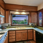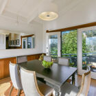 The stylish kitchen blends beautiful wood cabinetry, classic tile countertops, a vintage Chambers cooktop with griddle, and leaded casement windows with a modern Themador hood, built-in dual ovens, Bosch dishwasher, and a wood-framed greenhouse window with a sweeping view of the bay. Beneath a vaulted beamed ceiling, the adjacent dining room enjoys two oversized picture windows overlooking the bay.