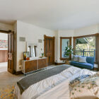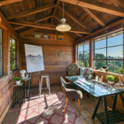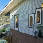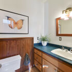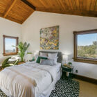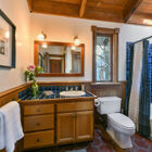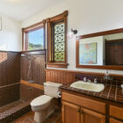 Framed by a wide bay window overlooking the hills, the owner’s suite has access to a private railed deck - a peaceful spot for morning coffee or evening contemplation of the stars. The adjoining bath is an eclectic blend of unique materials, featuring rustic floor tiles, vintage wainscoting, a deep tile-topped vanity beneath distinctive sconces, and a splendid walk-in shower of intricately patterned tile.