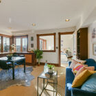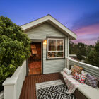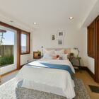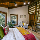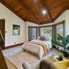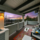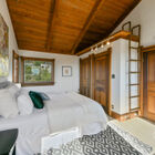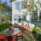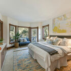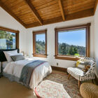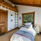 On the upstairs landing, sun pours through a custom window created by Sausalito artist Rosalis. Each of three generous bedrooms on the upper level enjoys unique whimsical features - two with loft sleeping spaces and windows on the bay and one with a bay window on the hills and floor-to-ceiling shelves with a library-style ladder. The bedrooms share a huge bath with rustic hexagonal floor tile, vaulted beamed ceiling, shower over tub beneath a skylight, a tile vanity, and large linen closet for storage.