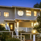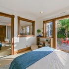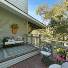 Also on the lower level, a studio in-law or guest apartment with a private entrance is a light-filled space with corner windows overlooking the bay. Glass doors open onto a private brick patio beneath an arbor covered with trailing vines of wisteria. To the rear, French doors open onto a small back deck screened by trees.