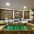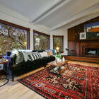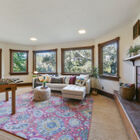 The sunken living room is a beautiful display of woodwork with its vaulted wood ceiling, gleaming expanse of hardwood floors, and massive wood fireplace with decorative tile. Majestic oaks surround the wide bay windows, creating the feel of a giant treehouse.