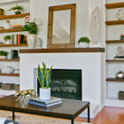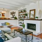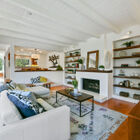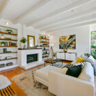 The design of this spacious home creates a striking sense of openness and flow. The generous entryway opens onto a sunken living room lined with oversized windows that fill the room with light. A windowed nook looking out over the peaceful neighborhood would be ideal for an easy chair or a window seat for quiet contemplation. Gleaming maple floors and a plank ceiling with exposed beams add visual interest, while a brick fireplace flanked by built-in shelves graces one wall.