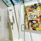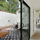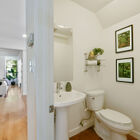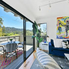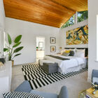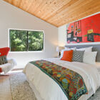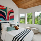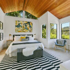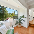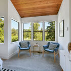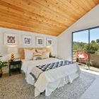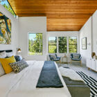 The open aesthetic continues on the second floor with large windows and strategically placed skylights. The light-filled owner’s suite boasts a vaulted plank wood ceiling, transom window, and a reading nook with windows on two sides overlooking the wooded hills.