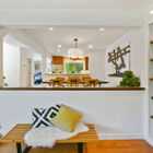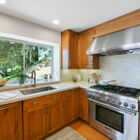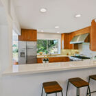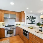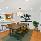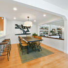 The living room flows into the formal dining room, separated only by a half wall. The dining room is large enough for dinners with extended family and friends, and the open layout lends itself to entertaining, with guests able to mingle and meander through the entire living area. On the other side, the dining room is separated from the kitchen by a breakfast bar for more casual meals. The stylishly updated eat-in chef’s kitchen features stone countertops with subway tile backsplash, polished wood cabinets, and wood-faced Thermador dishwasher. The home chef will appreciate the Thermador 6-burner gas range and space-saving built-in microwave, and an inset window above the sink is the perfect place to grow herbs.