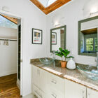 Sunlight streams through two skylights in the opulent adjoining bath. The tile walk-in shower features built-in seating, dual showerheads, and sparkling glass doors. A stone-topped vanity with dual vessel sinks provides abundant storage. A pocket door opens onto a walk-in closet with cedar floor and vaulted ceiling. A high stained glass window glows in the sunlight. The three remaining bedrooms enjoy dramatic vaulted ceilings of burnished wood and oversized windows looking out on the hills. One of the bedrooms features sliding glass doors out to a private deck.
