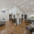 Upstairs, you will discover the vast L-shaped living and dining area, flooded with light from its ample windows and recessed lighting. Everything in this inviting space works together to create a bright and expansive feeling, from the ultra-chic steel stairwell railings to the white walls to the picture windows and soaring cathedral ceilings. The adjoining kitchen is a cook’s dream: With a well-placed skylight, graceful fixtures, ample storage, wraparound quartz countertops, 5-burner gas range, and stainless-steel microwave, refrigerator, dishwasher, and sink, the kitchen is the ideal place to cook for a crowd.