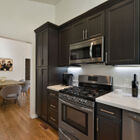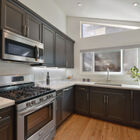 - Modern cook’s kitchen with skylight and vaulted ceiling, sleek modern fixtures, ample storage, wraparound quartz countertops, 5-burner gas range, and stainless-steel microwave, refrigerator, dishwasher, and sink