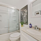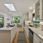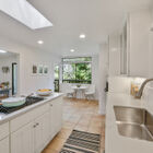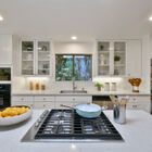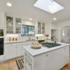 The large, updated eat-in kitchen is anchored by a central island with a built-in gas cooktop beneath a cheerful skylight. Other features bound to please the home chef include stone countertops with subway tile backsplash, built-in oven, ample cabinets, and a huge pantry for storing everything needed for a well-stocked kitchen. At one end, beneath oversized windows, a dining area is ideal for quick meals. Conveniently placed for entertaining, a glass door opens onto a deck with steps leading down to a shaded patio.