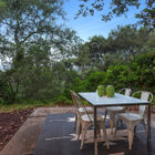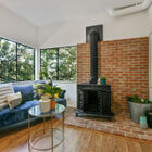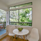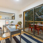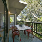 Inside, the entryway opens onto the spacious common area with gleaming hardwood floors where a wall of windows overlooking the treetops fills the rooms with natural light. From the open dining room at the back of the house, a door opens onto a sheltered patio along the hillside.