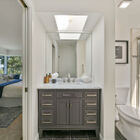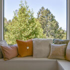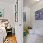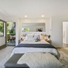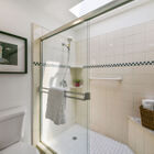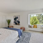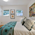 The large, sunny owner’s suite features a corner window seat overlooking the hills, with a filtered view of the bay beyond. A glass door opens onto the back deck shared with the office. The adjoining full bath is lit by a skylight above the tile walk-in shower with decorative accents and tile seat. A stone-topped vanity and large linen closet provide abundant storage.