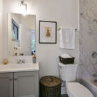 On the other side of the home are 3 additional bedrooms, each with their own charming features, including large closets and oversized windows with hillside views. The bedrooms share a full bath with vanity and shower over tub.