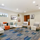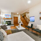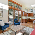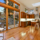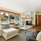 The home’s open floor plan and numerous large windows create a wide-open feeling of tranquility on the main level. The front door opens onto an entryway with a coat closet, and opens into a living room with a corner fireplace and a wall of windows overlooking the street below.