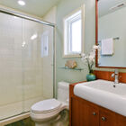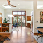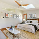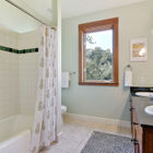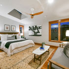 Above the main level is a private loft-style owner’s suite with a treehouse sensibility. Light pours into this luxurious retreat through corner windows and skylight, and a lovely modern wood ceiling fan hangs ready to stir the summer breeze. The spacious adjoining bath is a retreat in itself with an oversized Jacuzzi tub with tile surround, ideal for soaking away the stresses of the day. Here too, multiple windows and skylight create an atmosphere of tranquility. A glass-enclosed, tiled walk-in shower features two showerheads. A stone-topped vanity offers the convenience of dual sinks, and a large walk-in closet provides ample storage.