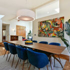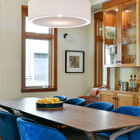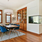 A unique built-in aquarium divides the living room from the bright and open formal dining room. Intimate enough for romantic dinners while large enough for a dinner with extended family or friends, the dining room features generous windows and built-in cherrywood cabinets and bench on one wall.