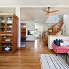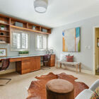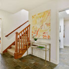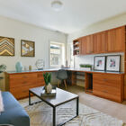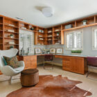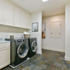 The lower level has a private entrance and the potential for conversion into a separate apartment. The flexible circular floor plan includes a spacious family/entertainment room with speaker system and built-in desk and shelves--ideal for doing homework or relaxing in front of the TV. The two generous bedrooms are currently configured as offices with built-in wood desks and shelves and large closets. They share a full bath with slate floor, walk-in shower, and wood-topped vanity with storage. Also on this level is a large laundry room with new Electrolux W/D, a utility sink, and ample drawers and cabinets. Stairs lead down to the huge 2-car garage.