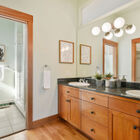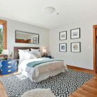Down the hall, two sunny bedrooms feature large windows and closets. The two share an updated bath with a tile shower over tub and stone vanity with dual sinks. A large window fills the room with light.