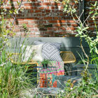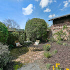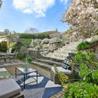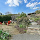 The expansive enclosed backyard is a dream come true for the home entertainer. A brick patio runs the length of the home and stone steps lead up to a terraced garden with a stone retaining wall, mature landscaping, raised planting beds, and a large level area to set out tables and chairs for guests. The stone steps continue to the next level to a small brick patio, and charming pergola.