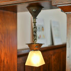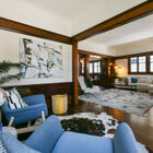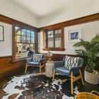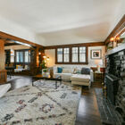 From the porch, the entryway reveals the high ceilings and open floor plan typical of the period. The living room beckons with its hardwood floors and wainscotting, coved ceiling, and wood-framed windows with the original glass. Lovely sconces glow above the original Klinker brick gas fireplace. On the other side of the entryway, the living room extends into a sitting area that could easily be converted to a home office