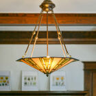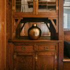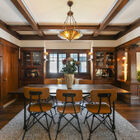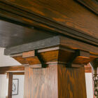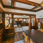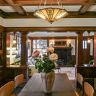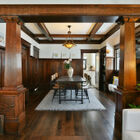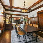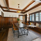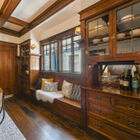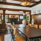 Pass through two gleaming wood pillars into the formal dining room with wood-beamed ceiling, lovely pendant light, and original built-in cabinetry with glass-paned doors. A built-in bench with storage sits beneath a row of windows that catch the afternoon sun.