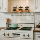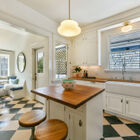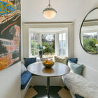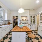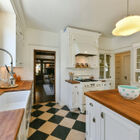 Adjacent to the dining room is the updated eat-in kitchen, remodeled with the architectural style in mind and incorporating some of the original cabinetry. Modern additions include an island with breakfast bar, butcher block countertops, farm sink, pop-out mixer stand, Miele Optima dishwasher, and a stunning Heartland Legend gas range and hood. At one end of the kitchen, an inviting sunny breakfast room with bay window and built-in bench seating overlooks the spacious backyard. Between the kitchen and breakfast room, a glass door leads out to the backyard.