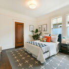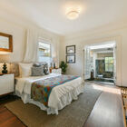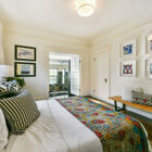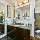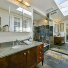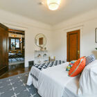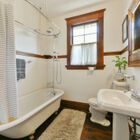 Craftsman-style homes of the early 1900s were often built with only one bathroom - an inconvenience in modern times. Here, a second bath has been added, creating a stylish owner’s suite. The bedroom features coved ceilings, huge closet, and French doors that open onto the bath. A skylight brightens the bath, and mirrors at either end reflect the light. The deep shower over tub is set into a slate-walled alcove with a slate surround that matches the floor, and a stone-topped vanity provides storage. Outside the owner’s suite, additional storage is provided by the original linen closet with the horizontal drop-down doors typical of the era. . The oversized windows and high coved ceiling give the remaining bedroom a sense of tranquility, and the adjoining updated bath features a delightful clawfoot tub with a rain showerhead and pedestal sink.
