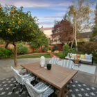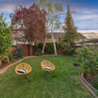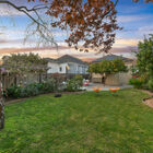 The substantial, enclosed backyard is a delight. The verdant lawn and large concrete patio would be perfect for neighborhood barbecues, a children’s play area, or both. Mature landscaping includes citrus trees, roses, and flowering shrubs, and planting beds, and a shed provides room for gardening equipment or barbecue tools.