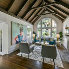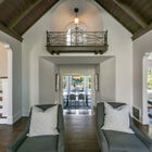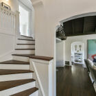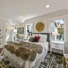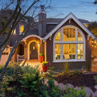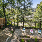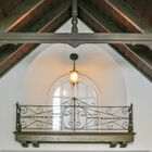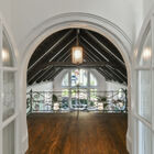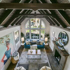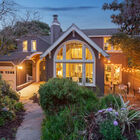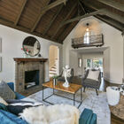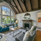 From the street, stone steps descend at a gentle slope through the verdant front garden to a brick patio. Behind the arched front door the spacious entryway leads to a gracious living room beneath a vaulted plank ceiling with exposed beams and a large arched window overlooking the enchanting front yard. A stone fireplace with wood mantle graces one wall and a whimsical Juliette balcony overlooks the room.