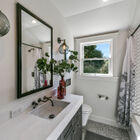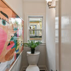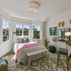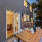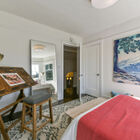 Upstairs, the large primary bedroom is warm and inviting with recessed lights and sunny windows. Two generous closets - one with a built-in dresser - provide abundant storage space. A bay window sheltered by tall trees creates a cheerful treehouse sensibility in the second bedroom, and at the end of the hall a third bedroom overlooks the back deck and the front patio. The shared bath has been updated with modern hexagonal tiled floor and chevron tiled shower over tub and a stone-topped vanity.