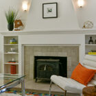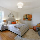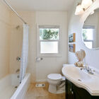 Two generous bedrooms, each with their own charming features, share a full bath with tile shower over tub with tile surround, and vanity for storage.