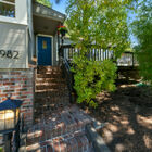 On the ground level is a living room and distinctive dining area set within a beautiful 5-sided bay window overlooking the wooded backyard. The modern kitchen features stone countertops with subway tile backsplash, gas range, and a laundry nook. A separate exit opens onto a flagstone pathway leading to the street.