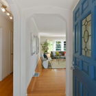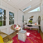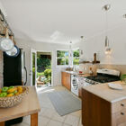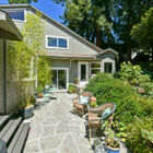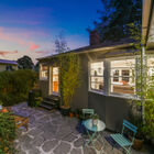 From the back patio, stone steps lead to the glorious backyard, an enchanting space for entertaining under the stars or tranquil meditation among a profusion of ferns, succulents, flowering plants, climbing roses, and trailing nasturtiums. As a bonus, citrus and pear trees provide fruit.