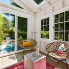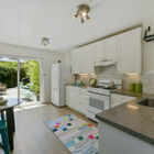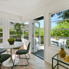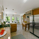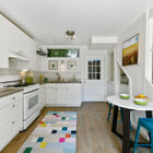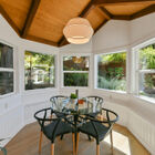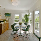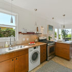 The updated eat-in kitchen features a gas range, beautiful wood cabinets, a hanging pot rack, expansive tile and stone countertops beneath distinctive pendant lights, pantry cabinet, and a Haier European washer/dryer unit. Corner windows catch the sun, and a glass door opens onto the back patio. At the other end of the kitchen, the sunny dining area is lit by large windows and a glass door opens onto the front deck.