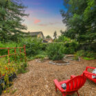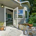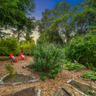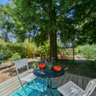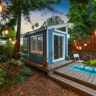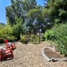 At the back of the yard, in the shade of a redwood tree and behind a flower-covered trellis, a whimsical Tiny House is yet another space with abundant potential. The building has its own wood deck, planting beds, and permaculture vegetable garden. Inside, the vaulted ceiling with three skylights and multi-pane windows fill the space with light. Plumbed for water and sewer, electricity and spigots for water are just a few yards from the building.