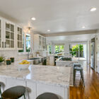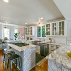 Anchored by an expansive island with Jenn Air 5-burner cooktop and breakfast bar, the fabulous chef’s kitchen features Carrara marble countertops with a second breakfast bar, abundant storage, and a dual farm sink. The discerning home chef will appreciate the below-counter drawer microwave, Jenn Air dishwasher, fridge, and built-in oven. The kitchen is open to a light-filled breakfast nook with built-in corner bench seating, and sliding glass doors onto the rear deck are conveniently placed for taking drinks and hors d'oeuvres out to guests.