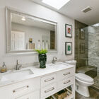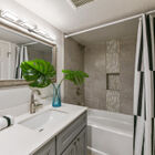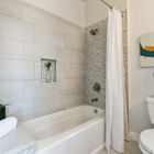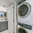 At the back of the home a short hallway leads to the sophisticated owner’s suite with gleaming white oak floors, soft recessed lighting, a distinctive stacked stone fireplace, and dual closets with mirrored doors. A gorgeous skylight fills the adjoining spa-like bath with natural light. A huge walk-in shower with a stacked stone wall, decorative tile accents, and frameless glass door is the height of luxury, and a dual stone vanity provides abundant storage. Also on this level are a large full bath with shower over deep tub and a laundry area with Electrolux stacking washer and dryer and large cabinets. Upstairs, three sunny bedrooms - each with their own distinctive features - share a large modern bath with dual stone vanity and beautifully tiled shower over deep tub.