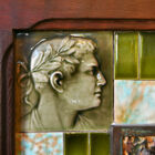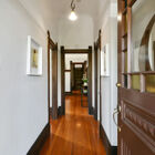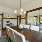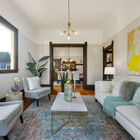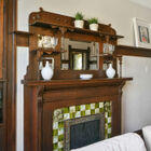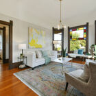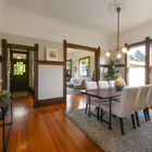 To the left of the entryway, a light-bathed living room with bay windows looks out onto the street. Typical of the Victorian era, doorways are graced by carved ornamental wood trim, and light fixtures decorated by carved medallions. Double pocket doors lead to a formal dining room with embossed wallpaper, fireplace with decorative tiles, hardwood floor, and original built-in cabinetry.