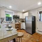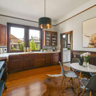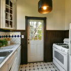 A gracious breakfast room boasting period wainscotting, and built-in shelving is lit by large windows, for a leisurely breakfast in the sun. The adjacent kitchen features a gas range, tile countertops, and a window above the sink overlooking the backyard. For ease of outdoor entertaining, the kitchen door allows you to carry hors d’oeuvres on to the sunny wooden deck, or down the stairs to a brick patio large enough for neighborhood barbeques.