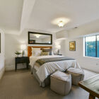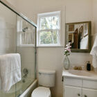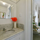 The bedrooms are flooded with light: one faces the porch with two tall windows, the other features a lovely bay window. The two bedrooms are connected by a powder room, and at the end of the hall is a full bath with tile floor, single solid-surface vanity, and tile shower over tub.