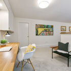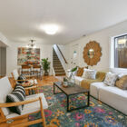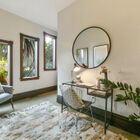 A bonus room with built-in shelves and a trio of large windows overlooking the beautiful backyard is a tranquil nook for a desk, or an easy chair for sitting in the sun, daydreaming about the future. On one side, stairs lead to the apartment below.