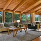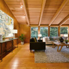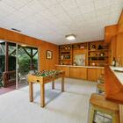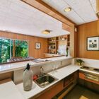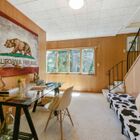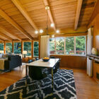 - Expansive living/dining area with fireplace, original wood paneling, and large windows overlooking redwoods and canyon